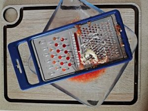 Lava bien y pica los pimientos y la cebolla. Retira la membrana y semillas del pimiento. Lamina y pica la zanahoria y ralla los tomates con el ajo