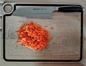 Lava bien y pica los pimientos y la cebolla. Retira la membrana y semillas del pimiento. Lamina y pica la zanahoria y ralla los tomates con el ajo