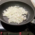 2. 2. Pochar el ajo y cebolla con un poco de sal y hoja de laurel;
