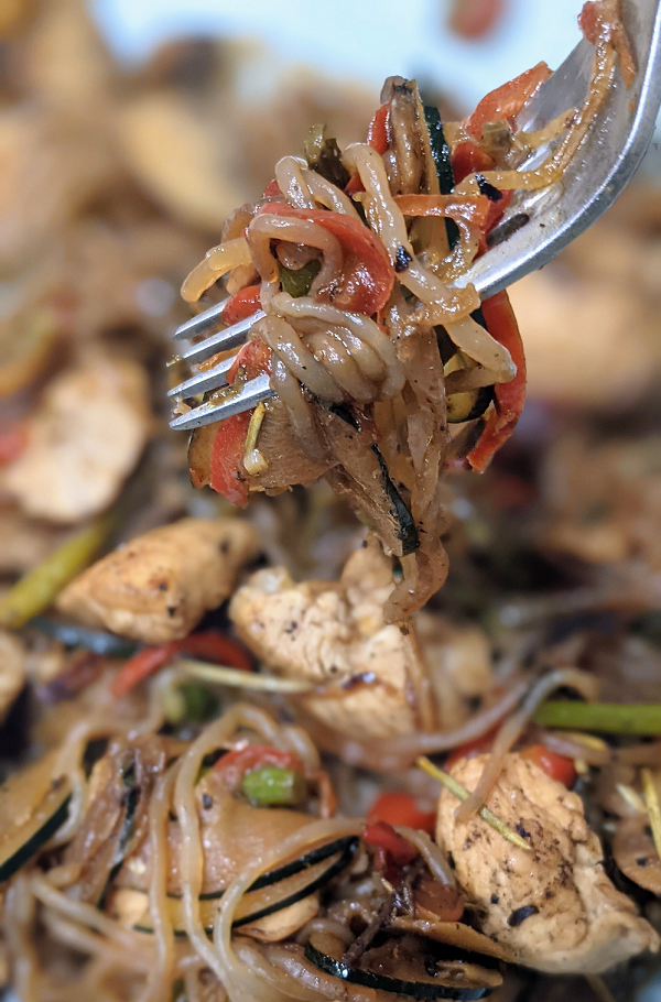 Gracias al konjac, una pasta prácticamente sin calorías y rica en fibra, disfrutarás de un plato abundante y delicioso que no te dejará con hambre. Acompañado de verduras salteadas y pollo a la plancha, es una opción equilibrada, rápida de preparar y perfecta para tus comidas