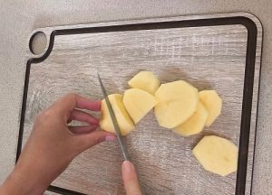 Lava y pela las patatas. Córtalas en láminas finas (2–3 mm) o en dados de 1 cm, todas del mismo grosor. Pela la cebolla y córtala en juliana fina.