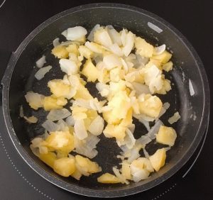 Calienta el AOVE en una sartén. Añade la patata y la cebolla bien escurridas (mejor secas con papel), sala y pon especias al gusto —yo usé ajo y pimienta negra.— Saltea a fuego medio 4–6 min, moviendo suave para dorar sin romper. Si quieres un toque más crujiente, sube el fuego 1 min al final. Retira cuando estén tiernas y ligeramente doradas.