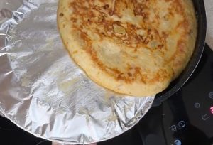Cuando los bordes se despeguen fácil con la espátula, coloca una tapadera más grande que la sartén cubierta con papel de aluminio. Cubre la sartén con la tapadera y gira con cuidado para volcar la tortilla sobre la tapadera. Deslízala de nuevo a la sartén para cocinar el otro lado 2–4 min, según te guste más cuajada o jugosa.